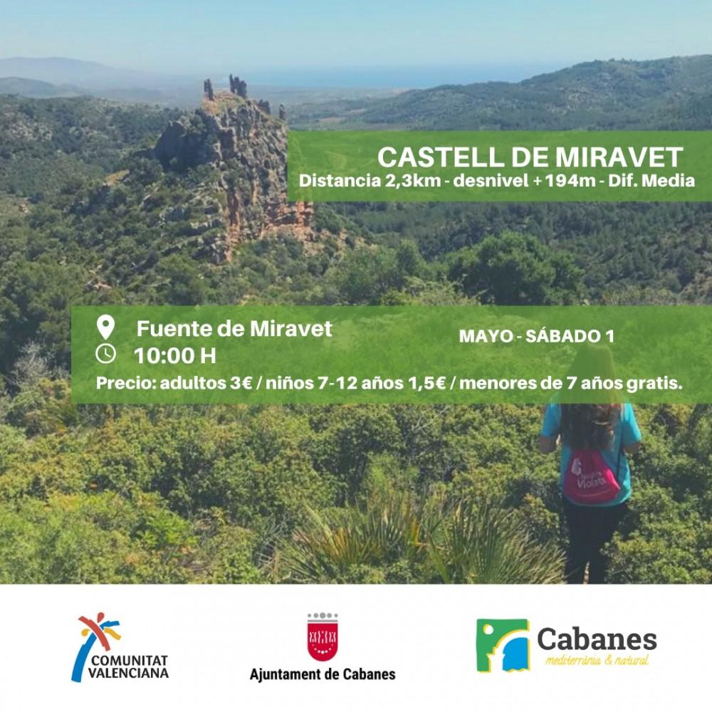 La regidoria de Turisme de Cabanes ha organitzat una ruta familiar per l'entorn natural del Castell de Miravet per a aquest dissabte 1 de maig. Així, grans i menuts tindran l'oportunitat de contemplar un paisatge de somni, conéixer la història de Miravet i aprendre sobre les diferents plantes aromàtiques i medicinals de la zona. Cal indicar que el preu de l'activitat, que començarà a les 10h, és de 3 euros per als adults; 1'5 euros per als xiquets i xiquetes entre 7 i 12 anys; i sense cost per als menors de 7 anys. Aquelles persones interessades a participar han d'apuntar-se a l'Oficina de Turisme. El telèfon de contacte és el 964 65 70 32 i l'e-mail cabanes@touristinfo.net .