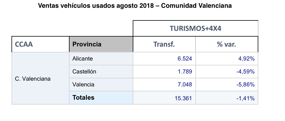 Como resultado del mes de crecimiento experimentado por el mercado de vehículos nuevos, que se disparó un 48,7%, las transferencias de turismos y todoterrenos usados disminuyeron un 1,4% en la Comunidad Valenciana en agosto en comparación con el mismo mes del año pasado, hasta situarse en las 15.361 unidades, según datos de la consultora MSI para la patronal de los concesionarios Faconauto.
