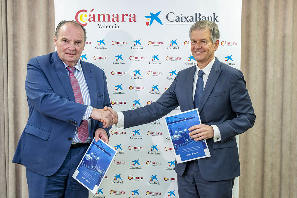 El director territorial de CaixaBank en la Comunitat Valenciana, Xicu Costa, y el presidente de Cámara Valencia, José Vicente Morata, han presentado este martes el informe ‘Las cadenas de suministro y su dependencia del exterior para las empresas de la Comunitat’, un estudio fruto del convenio entre ambas entidades.