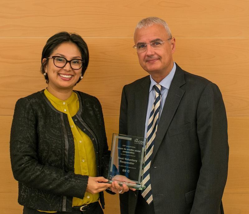 El Grupo Cooperativo Cajamar, a través del Banco de Crédito Cooperativo, su entidad cabecera, ha recibido el premio CDP Cambio Climático 2015 en la categoría de “Best Voluntary Responder”, al ser la entidad que ha logrado mayor puntuación en esta categoría. La distinción ha sido entregada por Diana Guzmán, directora Southem Europe de CDP Europe, a Javier Dueñas, director de RSC y Calidad del BCC-Grupo Cooperativo Cajamar en el transcurso de un acto celebrado en el Ministerio de Agricultura, Alimentación y Medio Ambiente.