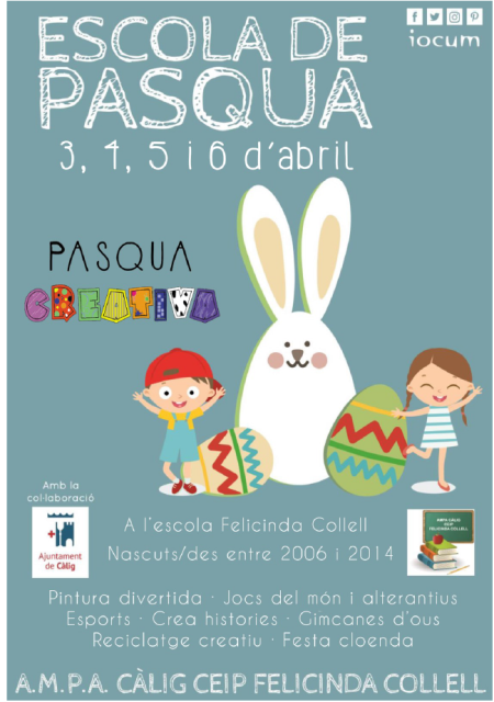 Las actividades se llevarán a cabo del 3 al 6 de abril a la escuela Felicinda Colell de 8:45 a 13:15 horas, y van a cargo de la empresa IOCUM, que se encarga de la confección y desarrollo de las mismas. Desde el Ayuntamiento de Càlig, tal y como señalaba la alcaldesa, Ernestina Borràs, “mantendremos siempre la colaboración con la AMPA para que en épocas no lectivas los padres i madres puedan conciliar sus responsabilidades familiares y laborales”.