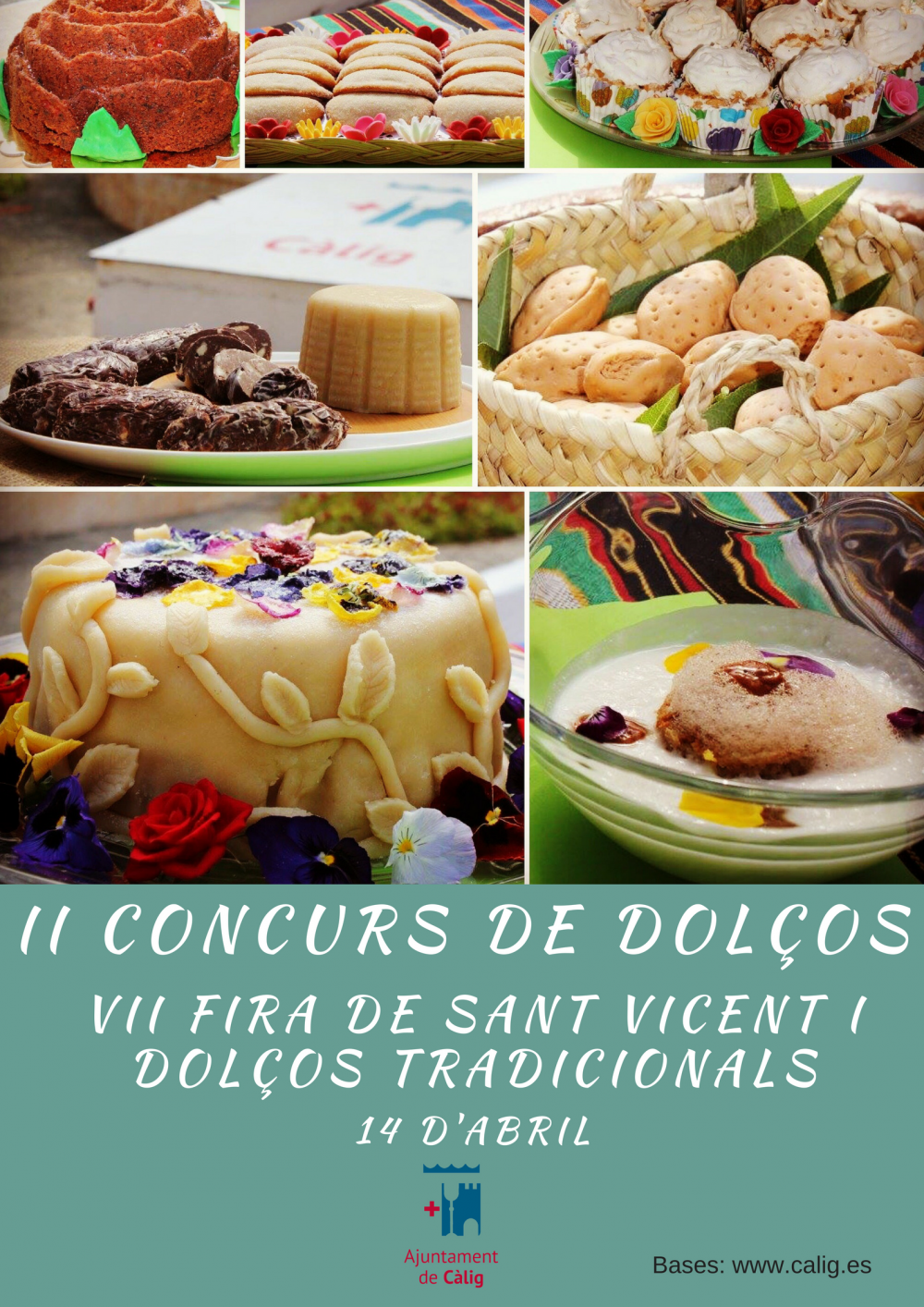 Ii Concurs de dolços (1)Emmarcat en la VII Fira de Sant Vicent i Dolços Tradicionals, que es celebrarà a Càlig els diez 14 i 15 d’abril, es troba enguany la segona edició del Concurs Popular de Dolços, que tindrà lloc dissabte a partir de les sis de la tarde a la plaça Nova. Prèviament, les persones interessades en participar en el concurs hauran de presentar la seua sol·licitud a l’Ajuntament de Càlig, fins al dia 13 d’abril.