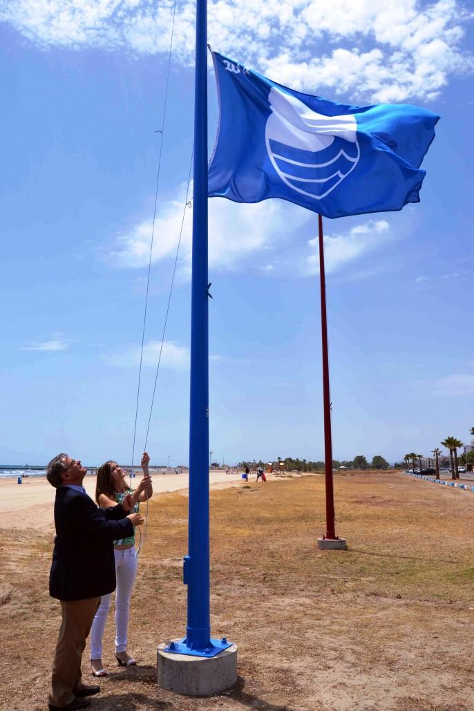 El alcalde de Burriana, José Ramón Calpe y la concejal de Turismo, Belén Sierra, han izado a primera hora de esta tarde las Banderas Azules de las playas de l'Arenal y del conjunto Malva-rosa y Grao; así como las enseñas Q de calidad que han otorgado la Generalitat Valenciana (Qualitur) y el Instituto para la Calidad Turística Española (ICTE).