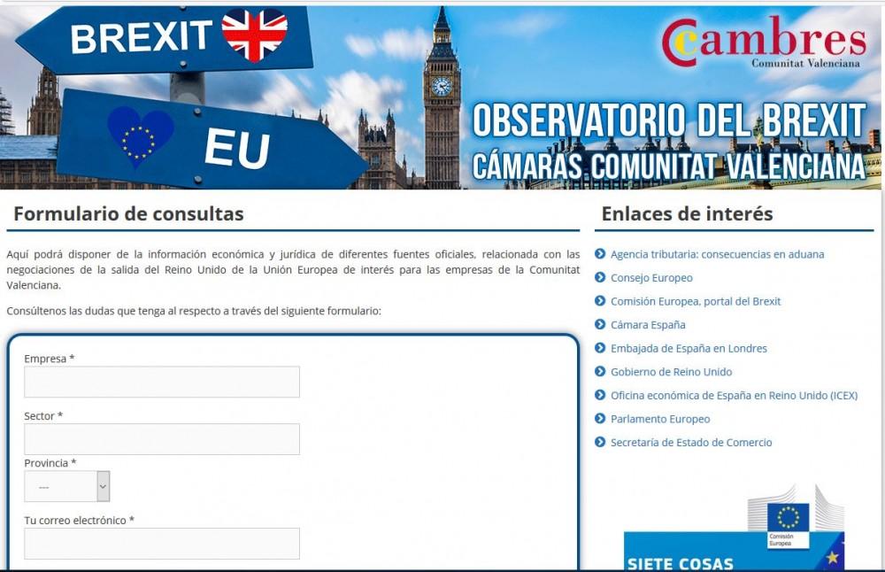 Las Cámaras de Comercio de la Comunitat Valenciana han habilitado un portal de consultas sobre el Brexit para que las empresas puedan plantear sus dudas sobre el proceso de salida del Reino Unido de la UE. La dirección del portal es brexit.camarascv.org, y se podrá acceder directamente o bien a través de banners ubicados en lugares destacados de las webs de las cinco cámaras de comercio de la Comunitat Valenciana: camaracastellon.com, camaralicante.com, , camaravalencia.com, camaraalcoy.net y camaraorihuela.es.