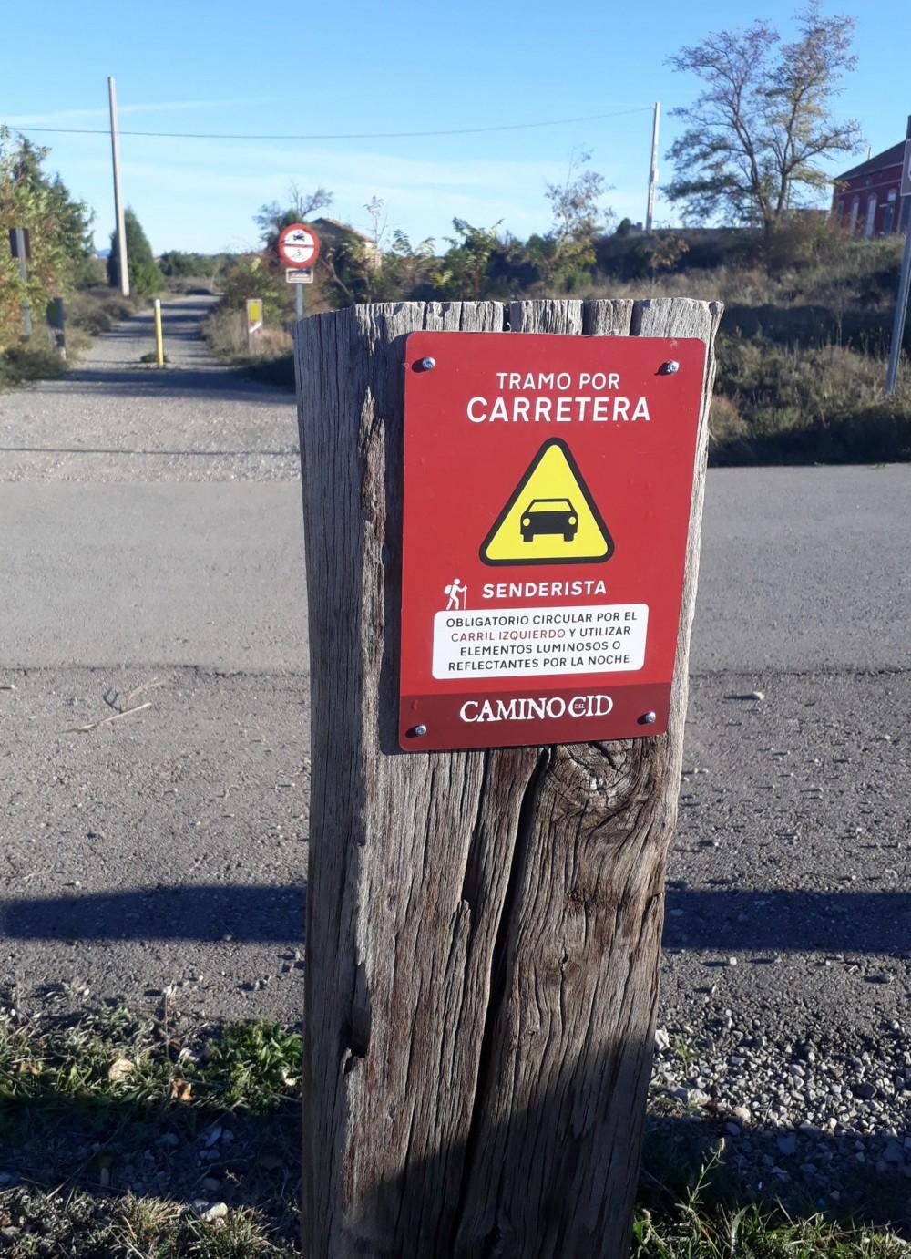 La ruta incorpora a su señalización carteles de advertencia para senderistas en los tramos por carretera