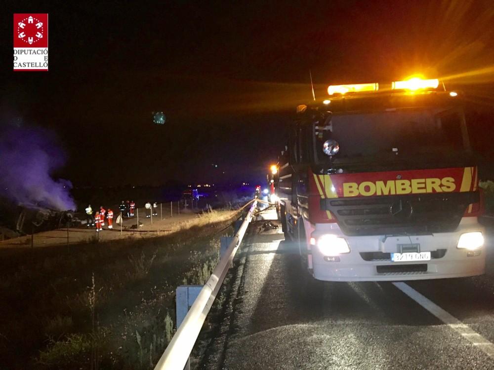 Al parecer un camión articulado se a incendiado a consecuencia de dicho accidente por lo que ha sido necesaria la intervención de dos dotaciones de bomberos del Parque de la Plana Baixa así como la ayuda de dos camiones nodriza para el abastecimiento de agua durante los trabajos de extinción, uno perteneciente al parque del Baix Maestrat y otro de los Bomberos de Castellón.