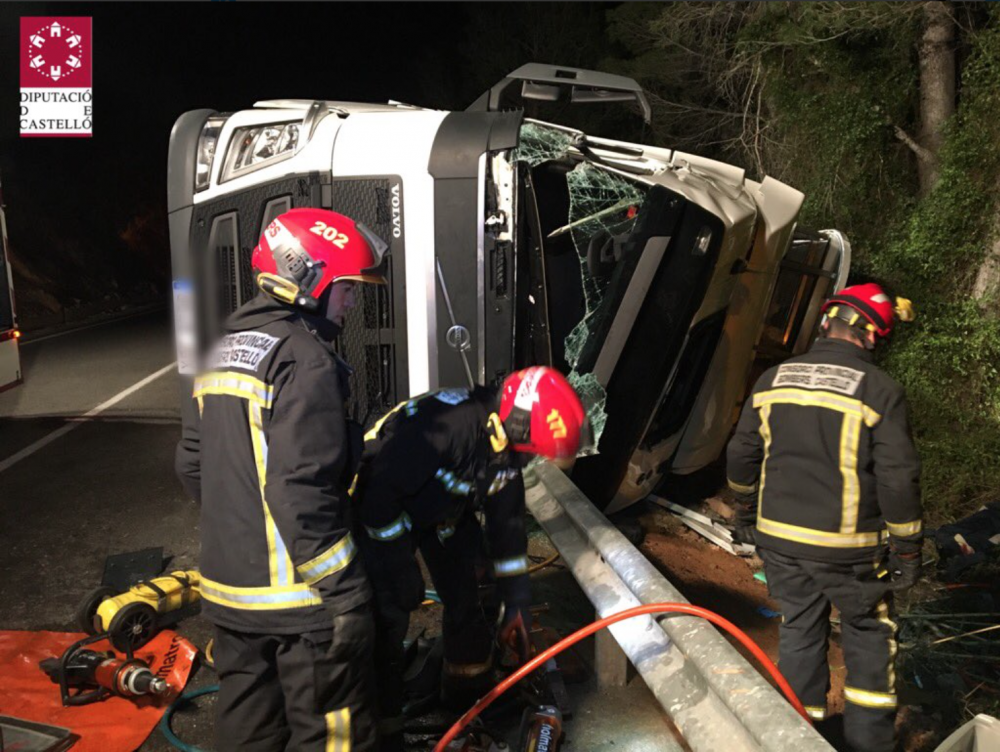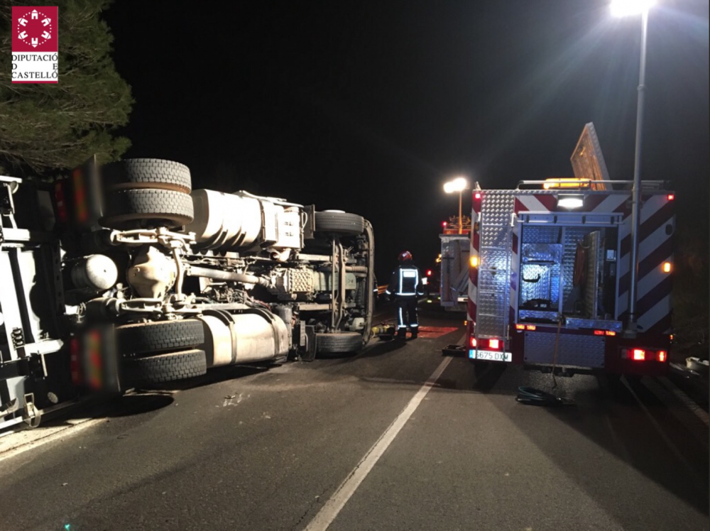 Una dotación del Consorcio Provincial de Bomberos de Castellón del Parque Baix Maestrat ha sido movilizado a un accidente de tráfico con un camión implicado en la CV10 a su paso por Sant Mateu. El vehículo ha volcado y el conductor ha quedado atrapado en el interior. El CPBC ha tenido que liberarle y ha sido atendido por SAMU que lo ha trasladado al hospital. El camión transportaba pollos y algunos han muerto como consecuencia del accidente. Finalmente la Guardia Civil se hace cargo del servicio.
