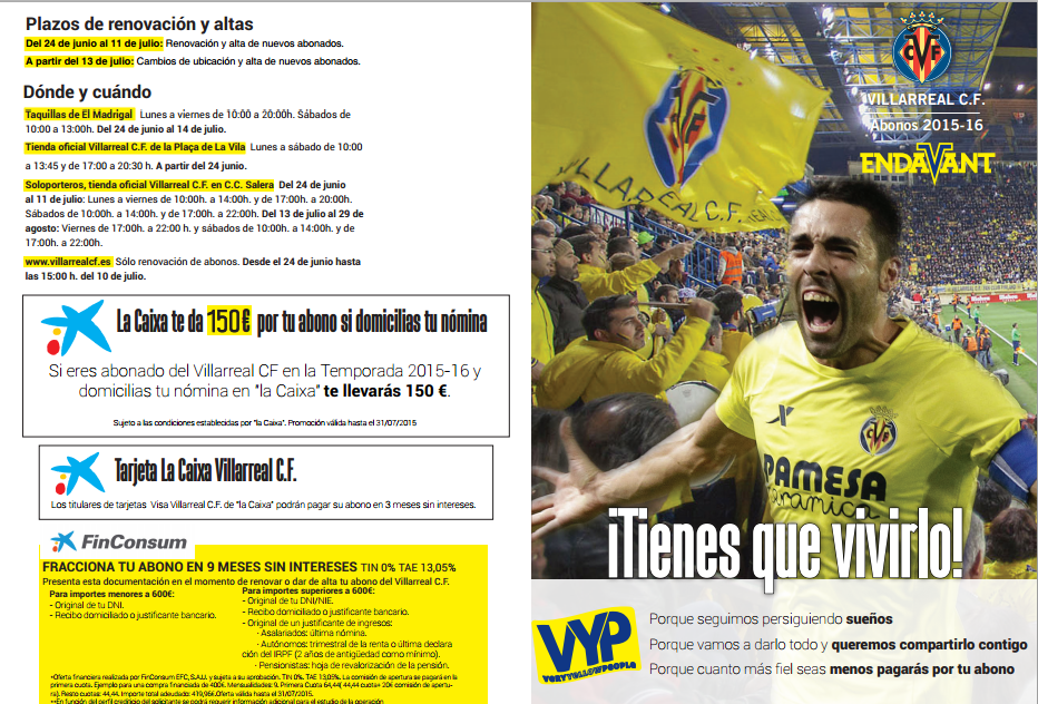Web oficial del Villarreal CF: www.villarrealcf.es (solo renovación de abonos desde el 24 de junio hasta las 15.00 horas del 10 de julio)