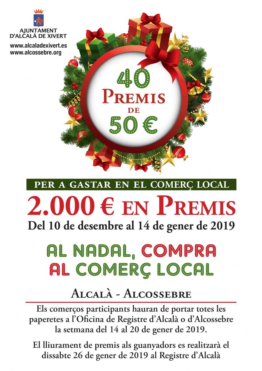 La campanya nadalenca 'A Nadal, compra al comerç local' posada en marxa des de la Regidoria de Comerç d'Alcalà-Alcossebre repartirà 2.000 euros entre els que realitzen les seues compres en els establiments del municipi, del 10 de desembre al 14 de gener. En efectuar la compra, els clients hauran d'omplir una butlleta que entrarà en el sorteig de 40 premis de 50 euros en xecs-regal. D'aquesta manera, els beneficis reverteixen de nou en el comerç local.