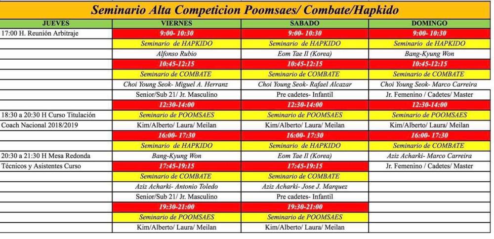 En paralelo con la competición, el Palacio d’Or acogerá 3 días de seminarios de Alta Competición orientados a potenciar las capacidades técnicas y atléticas de los deportistas en las disciplinas de: Poomsae, Combate y Hapkido, que serán impartidos por la élite a nivel mundial, por entrenadores de deportistas olímpicos y mundiales. Los seminarios estarán abiertos al público de modo que cualquier persona que lo desee podrá acceder a las instalaciones deportivas de Marina d’Or para ser testigo de excepción de estos talleres.