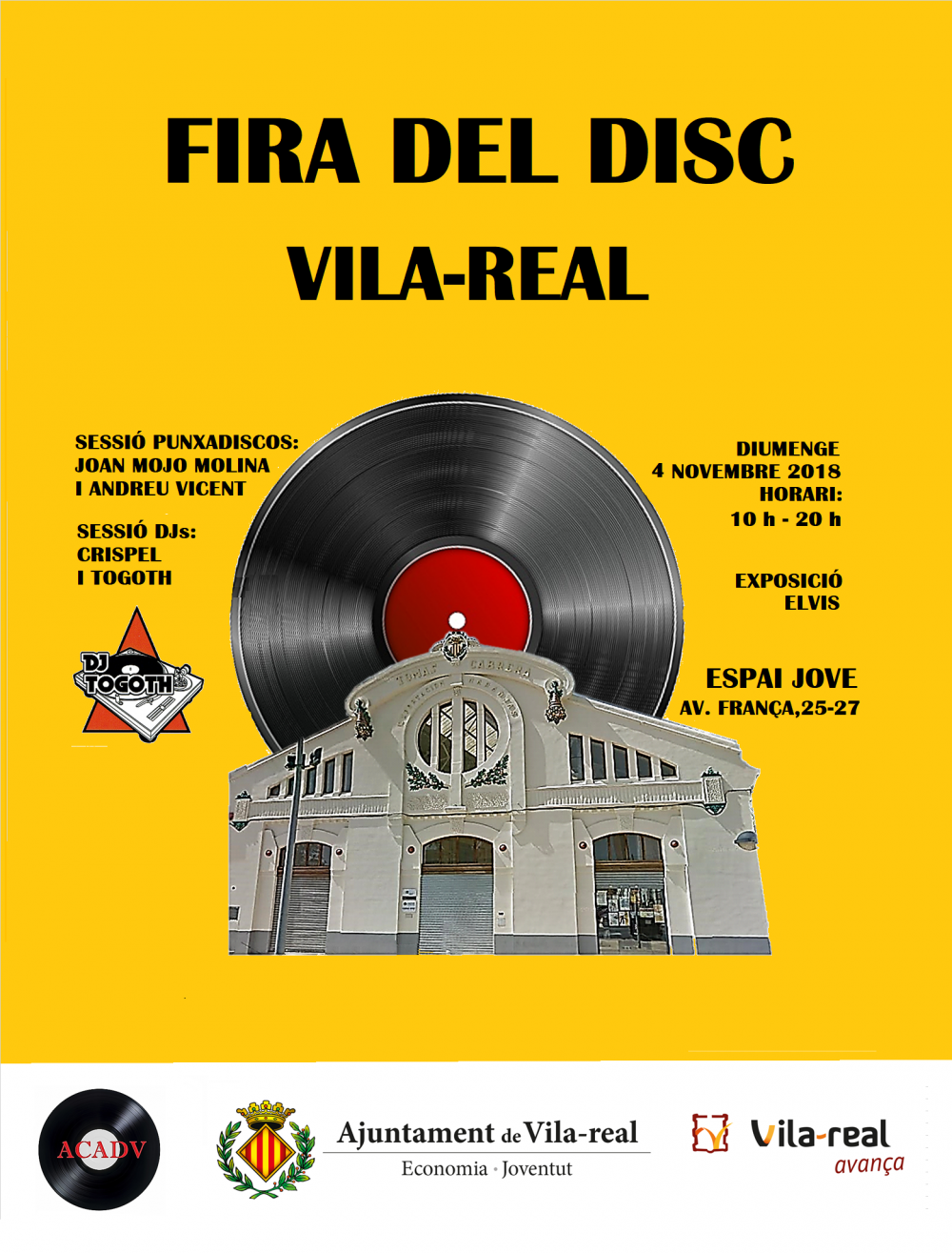 El diumenge la festa es trasllada a l’Espai Jove (avinguda de França, 25), on se celebrarà la Fira del Disc, a càrrec de l'associació cultural Amics del Disc de Vinil, amb la col·laboració, novament, d'ambdues regidories. De 10.00 a 20.00 hores, els afeccionats a aquest suport musical podran trobar una infinitat de discos de diferents èpoques i gaudiran de música en directe durant tot el dia, a càrrec dels DJ Togoth, Joan Mojo i Andreu Vicent, que s'uneixen al programa musical Dolentes vibracions, al DJ Crispel, i a l'exposició 'Elvis'. L'entrada és gratuïta fins a completar l'aforament.