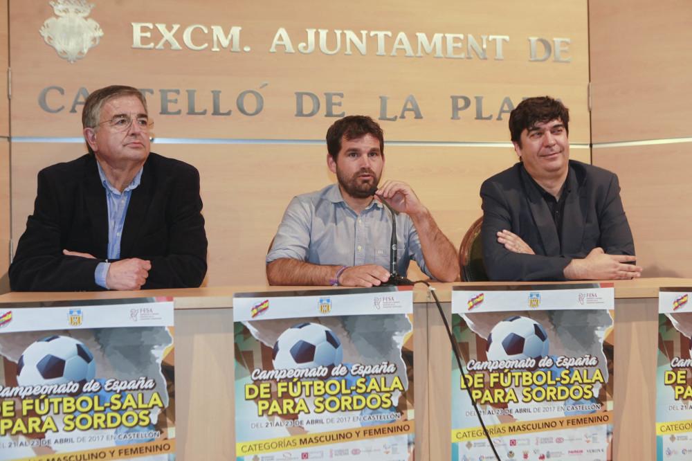 Castelló alberga aquest cap de setmana, 22 i 23 d'abril, el Campionat d'Espanya de Futbol Sala per a Sords. El regidor d'Esports, Enric Porcar, ha presentat aquest matí el programa de la competició que comptarà tant amb una modalitat masculina com una femenina i que està organitzat pel Club Esportiu de Sords de Castelló de Asorcas (Associació de Persones Sordes de Castelló). Porcar ha estat acompanyat en la presentació per Vicente Julián, organitzador del campionat i per Santiago Poveda, president de la Federació Espanyola d'Esports per a Sords.