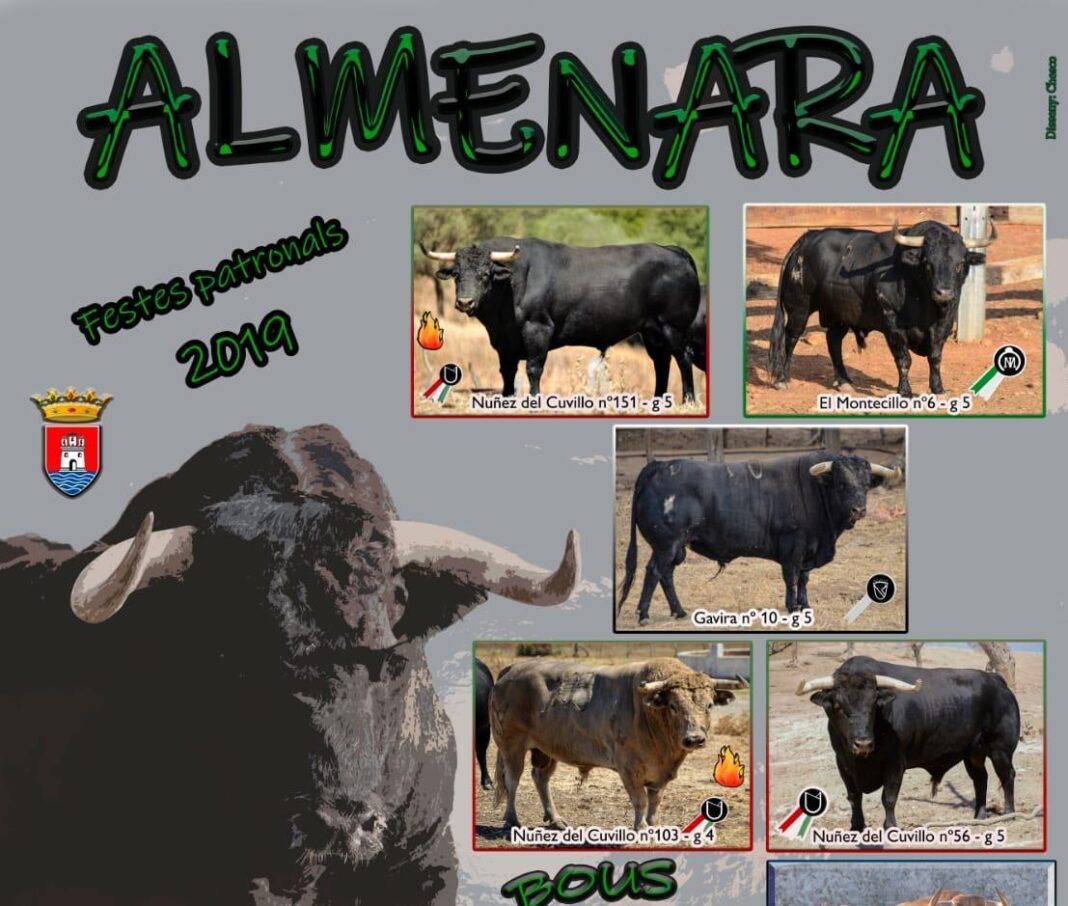 L'Ajuntament d'Almenara ha presentat el nou cartell taurí per a les festes patronals amb la substitució de dos dels bous previstos després de rescindir el contracte amb la ramaderia d'origen. El nou cartell tindrà, per tant, la incorporació d'un bou de El Montecillo i un exemplar de Núñez del Cuvillo, que eixiran al carrer en les jornades del dissabte 21 i dimarts 24. D'aquesta manera l'Ajuntament d'Almenara continuarà patrocinant sis bous, sent tres de Núñez del Cuvillo, i un exemplar de El Montecillo, Gavira i Santiago Domecq.