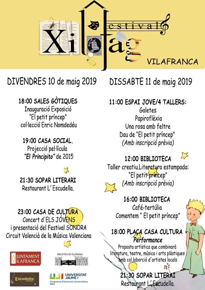Així mateix, divendres 10 i dissabte 11 tindrà lloc el Xilòfag Festival amb multitud d'activitats. D'aquesta forma, el divendres a les 18h les Sales Gòtiques acolliran la inauguració de l'exposició 'El Petit Príncep' de la col·lecció d'Enric Nomdedéu i que podrà visitar-se fins al dia 19. A les 19h a la Casa Social es projectarà la pel·lícula "El Principito" de 2015. El Restaurant L'Escudella acollirà des de les 21.30h un sopar literari.