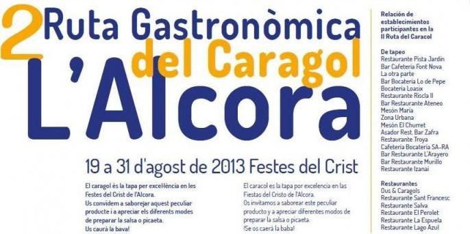 El objetivo de la II Ruta Gastronómica del Caracol es dar a conocer esta arraigada tradición alcorina y al mismo tiempo disfrutar de un manjar exquisito. Los vecinos y visitantes tendrán la oportunidad de degustar las diferentes formas de cocinar este producto. Este año, como novedad se ha diversificado la oferta y los restaurantes incluirán platos que incluyen el caracol cocinado con otros ingredientes como rabo de toro, langostinos, conejo o vainas de soja tiernas. Desde la oficina Turist Info, instalada en el Museo de la Cerámica, se está coordinando esta campaña que espera sea muy positiva para la localidad a efectos de promoción turística.