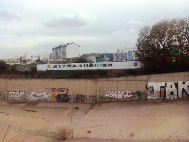 La pintada en cuestión contiene la expresión Ante un empleo, los españoles primero, que “pone en el centro de la diana a las personas inmigrantes que viven en Castellón”. “La responsabilidad de los gobiernos es crear empleo para todas y todos, sin distinciones y sin exclusión”, afirma. El texto está firmado con el logotipo de Democracia Nacional Joven, un partido de extrema derecha.