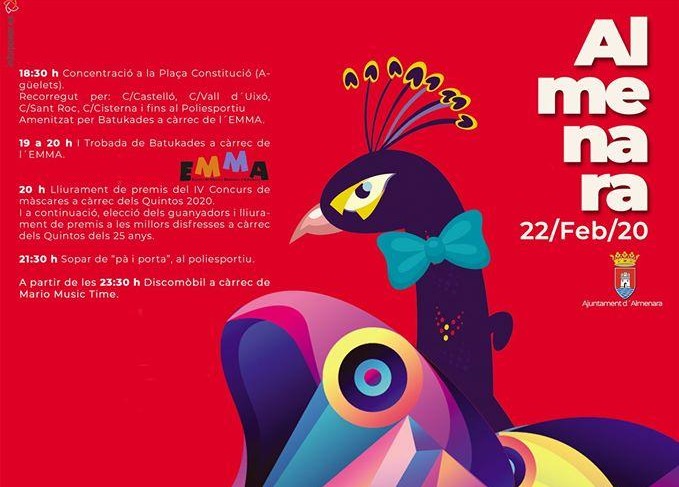 La localitat d'Almenara ja s'està preparant per a la celebració del carnestoltes 2020 que arribarà el dissabte 22 de febrer a la vesprada i nit. Enguany una de les grans novetats serà la I Trobada de Batucades organitzada per l'Escola de Música Moderna d'Almenara (EMMA) que a més del seu grup de batucada, compartirà cartell amb la batucada de "El Xarquet" de Massalfassar i la "Batuxech" d'Albuixech que amenitzaran el recorregut dels participants en la festa del carnestoltes i a més realitzaran una actuació conjunta en finalitzar en el poliesportiu cobert.