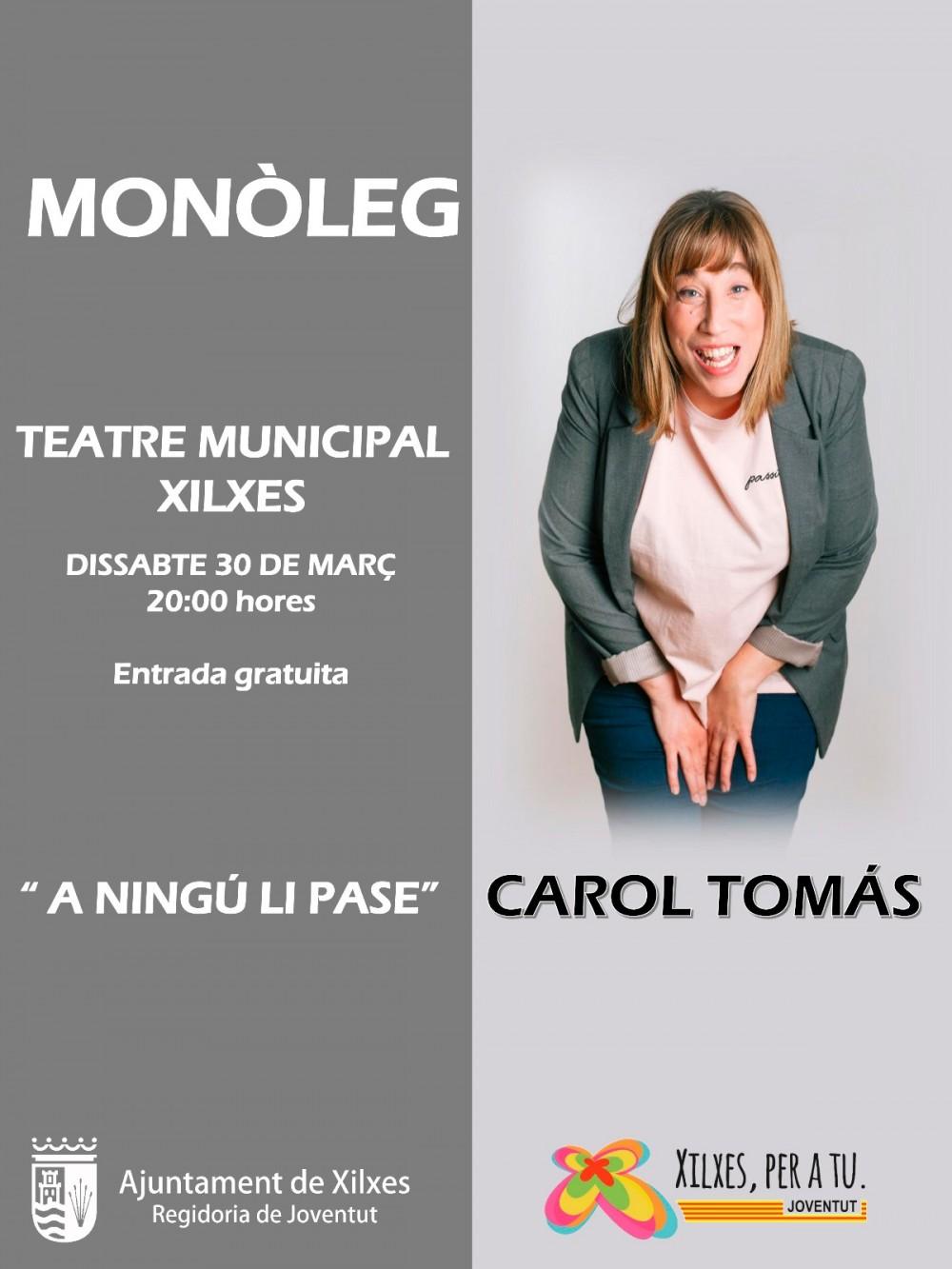 El Teatro Municipal de Xilxes acogerá el 30 de marzo la actuación de la cómica y monologuista valenciana, Carol Tomás, iniciativa de la Concejalía de Juventud que busca ofrecer nuevas propuestas que aporten un ocio constructivo al público joven.