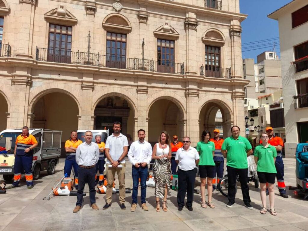 La primera edil de Castelló, junto con el concejal de servicios urbanos, Sergio Toledo, ha presentado hoy el plan de refuerzo de limpieza para la ciudad, en la que han estado presentes también los responsables de las empresas de limpieza, así como los operarios que trabajan en la misma.