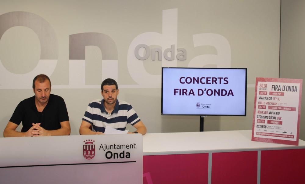 que tindran lloc durant la Fira d’Onda d'enguany, que superaran les 20 hores de música en directe. Asensio Blaya ha explicat al costat del responsable de BeMusic, Héctor Olaria, que “en aquesta edició hem buscat oferir diferents estils de música, ja siga electrònica com a Ley DJ o rock com Rosendo, perquè tothom gaudisca de les festes”.