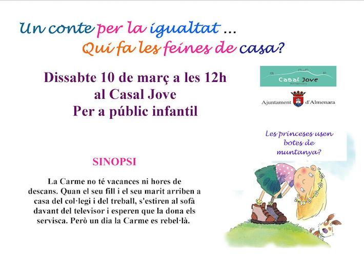 En aquesta ocasió, el contacontes s'emmarcarà dins de la programació de la Setmana de la Dóna que organitza l'Ajuntament d'Almenara a la qual se sumarà el Casal Jove. En aquest cas, com no podia ser d'una altra manera, la temàtica és la igualtat i els seus valors, que es transmetran al públic infantil. Aquesta serà la segona de les sessions previstes a càrrec de Donzel Sisters, sessions que tindran temàtiques diferents i en la qual també hi haurà interacció amb el públic infantil present.