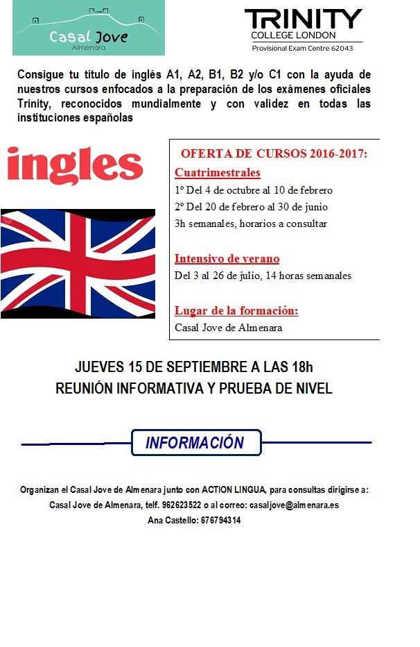 El Casal Jove d'Almenara acollirà aquest dijous 15 de setembre a les 18 hores la segona reunió informativa referent als cursos i exàmens oficials d'anglès que es realitzaran en aquestes instal·lacions des del Trinity College London. En aquesta ocasió també es realitzarà una prova de nivell gratuïta a les persones interessades. La regidora de joventut, Terebel Galiano, ha destacat que "després de l'èxit de la primera reunió i la demanda d'informació existent hem programat aquesta segona perquè la professora seguisca explicant totes les qüestions relatives als cursos i exàmens del Trinity que oferirem a Almenara sense necessitat de desplaçament a altres municipis".