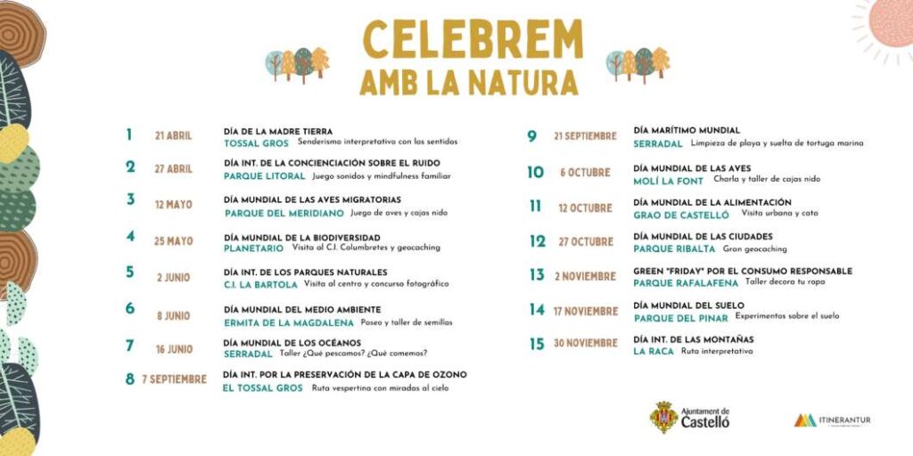 Bajo el lema ‘Celebrem amb la natura’, el proyecto consta de 15 jornadas temáticas en las que el público podrá sumarse a una amplia variedad de actividades, como senderismo interactivo, rutas vespertinas, talleres para crear cajas nido, ‘mindfulness’ familiar, concurso de fotografía, limpieza de playa y suelta de tortugas marinas o ‘geocaching’, entre otras.