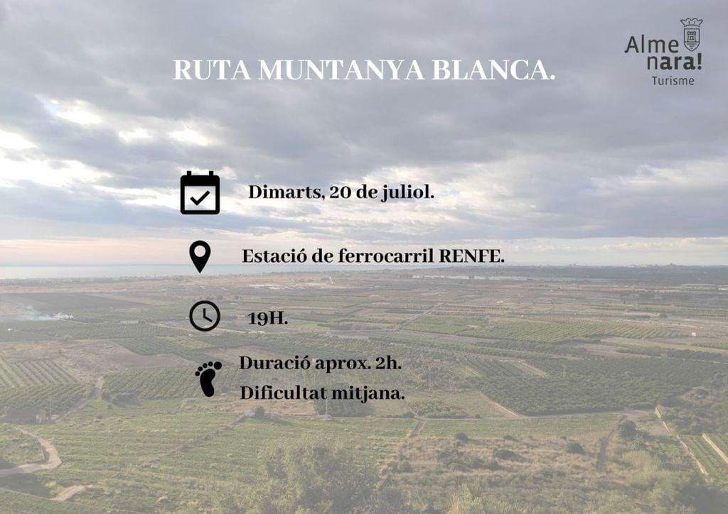 L'Ajuntament d'Almenara ha programat per al proper dimarts 20 de juliol una ruta fins a la Muntanya Blanca dins del programa 'Coneix el terme'. L'eixida serà a les 19:00h, des de l'estació de Renfe de la localitat, per a realitzar un recorregut d'aproximadament dues hores amb una dificultat mitjana.