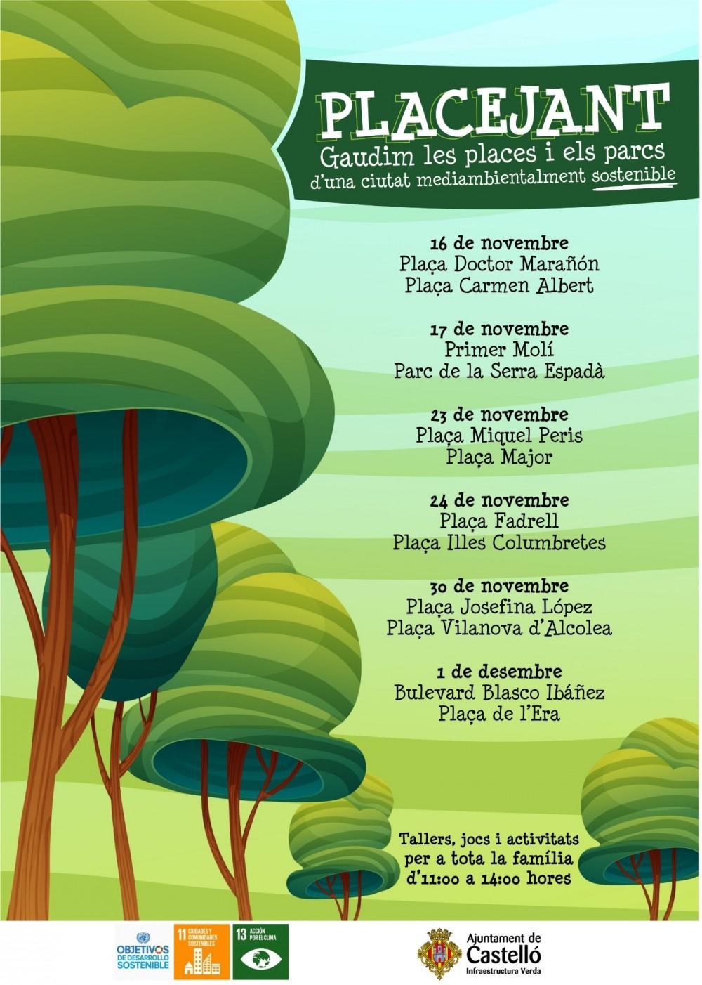 13-11-19 Cartell PlacejantLes activitats d'aquesta iniciativa denominada Placejant. Gaudim les places i els parcs d'una ciutat mediambientalment sostenible, es faran durant els pròxims tres caps de setmana, dissabtes i diumenges, en 12 places i parcs de Castelló, des de les 11.00 fins a les 14.00 hores. «Amb això, complim un dels compromisos recollits en el Acord de Fadrell, d'impulsar campanyes de conscienciació i participació mediambiental infantil amb tallers de reciclatge», ha assegurat la regidora responsable d'Infraestructura Verda.