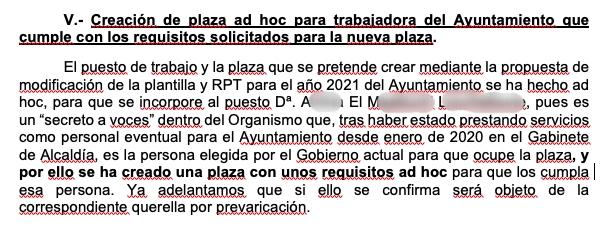 En relación a estas últimas afirmaciones, el jefe de Gabinete de Alcaldía advierte en su informe, de que puede ser objeto de acciones legales: “Con respecto a las elucubraciones sobre la supuesta creación ‘ad ohc’ de la plaza para una trabajadora eventual del GAbiente de Alcaldía, a la que hace referencia en las alegaciones, hay que hacer constar, que se trata de una opinión infundada, en la que se sugiere la comisión de un presunto ilícito penal, por lo que evaluará la posibilidad de interponer las acciones judiciales pertinentes, y así mismo se le trasladará a la persona afectada para que determine la posibilidad de emprender las acciones legales que considere”.
