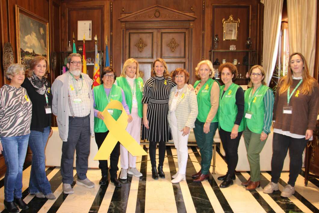 La alcaldesa de Castelló, Begoña Carrasco, ha recibido de manos de la gerente de la Asociación Española contra el Cáncer de Castellón, Salomé Esteller, el lazo amarillo conmemorativo.