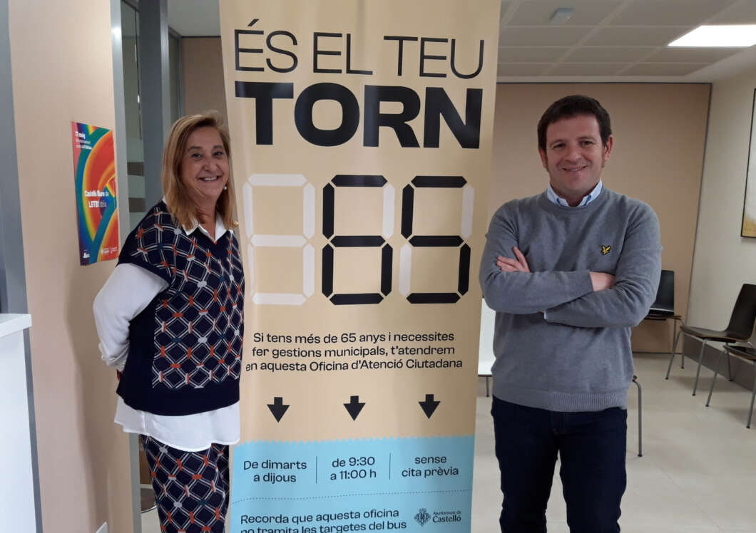 Les persones majors de 65 anys de Castelló podran realitzar gestions a l'Ajuntament, de manera presencial, de dimarts a dijous de 9.30 a 11.00 hores sense necessitat de cita prèvia. És una campanya, que sota el lema de 'És el teu torn' pretén reduir la bretxa digital que pateixen les persones majors, i que posen en valor l'Atenció Ciutadana més personalitzada, oferint una atenció que s'adequa a les seues necessitats i afavoresca la seua inclusió a l'hora d'accedir a l'Administració.