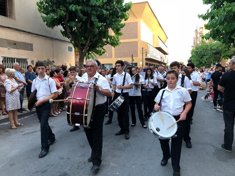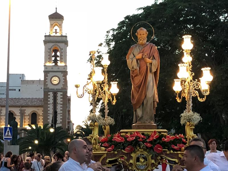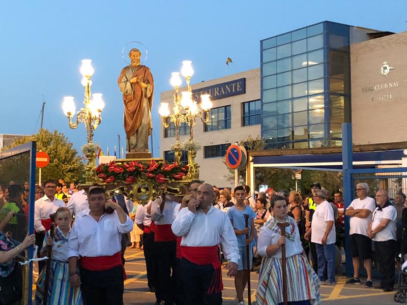 Sant Pere se hizo de rogar un poco más, pero también salió de la iglesia al volteo de las campanas, y la procesión, con la Banda de Música del Grao y grupos de bailes regionales, recorrieron las calles del Grao hasta llegar a la Cofradía de Pescadores, y a la dársena Pesquera.