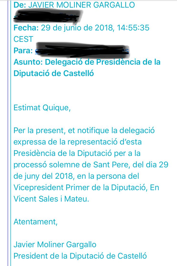 El presidente de la Diputación, Javier Moliner, había comunicado personalmente al Ayuntamiento de Castellón la imposibilidad de asistir por una situación de importancia e imprevista y señalaba en dicho mensaje la delegación expresa de la presidencia del acto en el vicepresidente primero de la institución provincial, Vicent Sales. Tras esta comunicación realizada a las 14:55 horas, el Ayuntamiento ha actuado de forma inexplicable desplazando al vicepresidente de la Diputación de la presidencia de la procesión a otro lugar que no le correspondía con el agravio que ello supone en el trato a la Diputación Provincial de Castellón que nunca antes había sido objeto de tal desprecio institucional por parte de ningún ayuntamiento de la provincia".