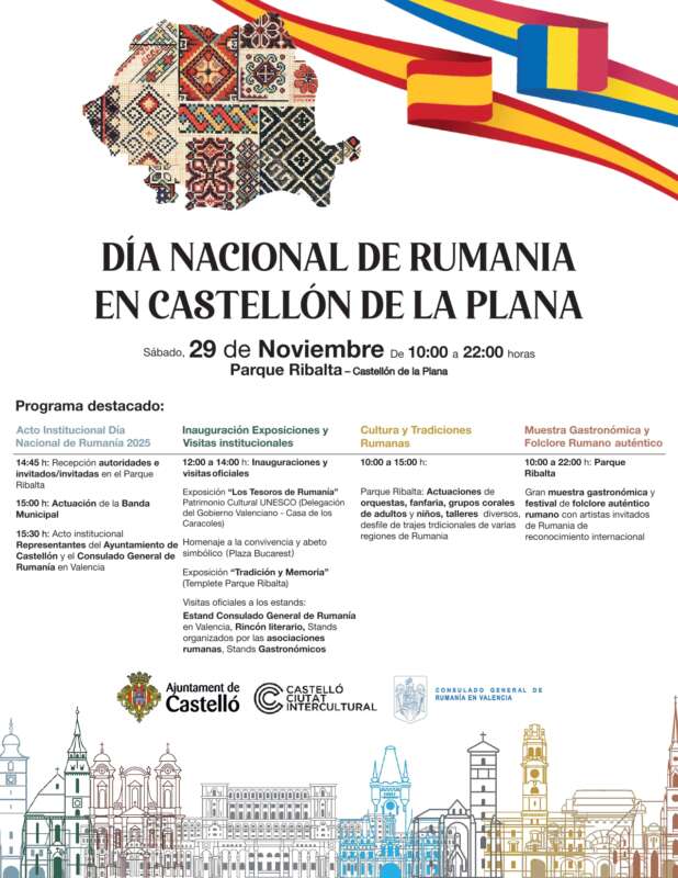 Castelló se prepara para celebrar el Día Nacional de Rumanía, una jornada que tendrá lugar este sábado, 29 de noviembre, y que estará repleta de actividades. El parque Ribalta se convertirá en el epicentro de esta conmemoración con la que la ciudad pretende reforzar su vínculo con una de las comunidades más numerosas y activas del municipio.
