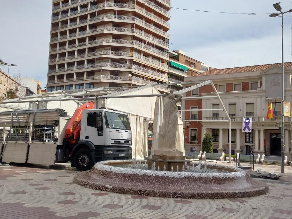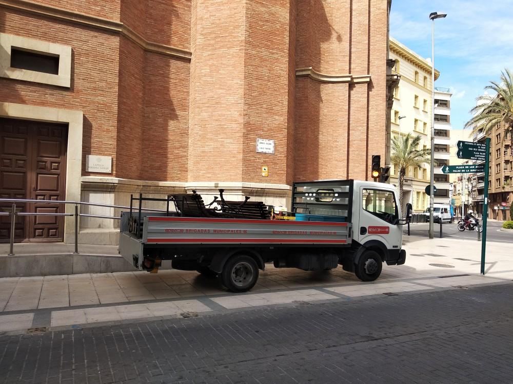 Junto a la puesta en marcha de todas estas infraestructuras, esta mañana operarios de las brigadas municipales estaban retirando distinto mobiliario de varias plazas de la ciudad, como bancos y algunos bolardos de cara a la semana de fiestas para dejar paso a los distintos desfiles que se celebrarán por el centro.