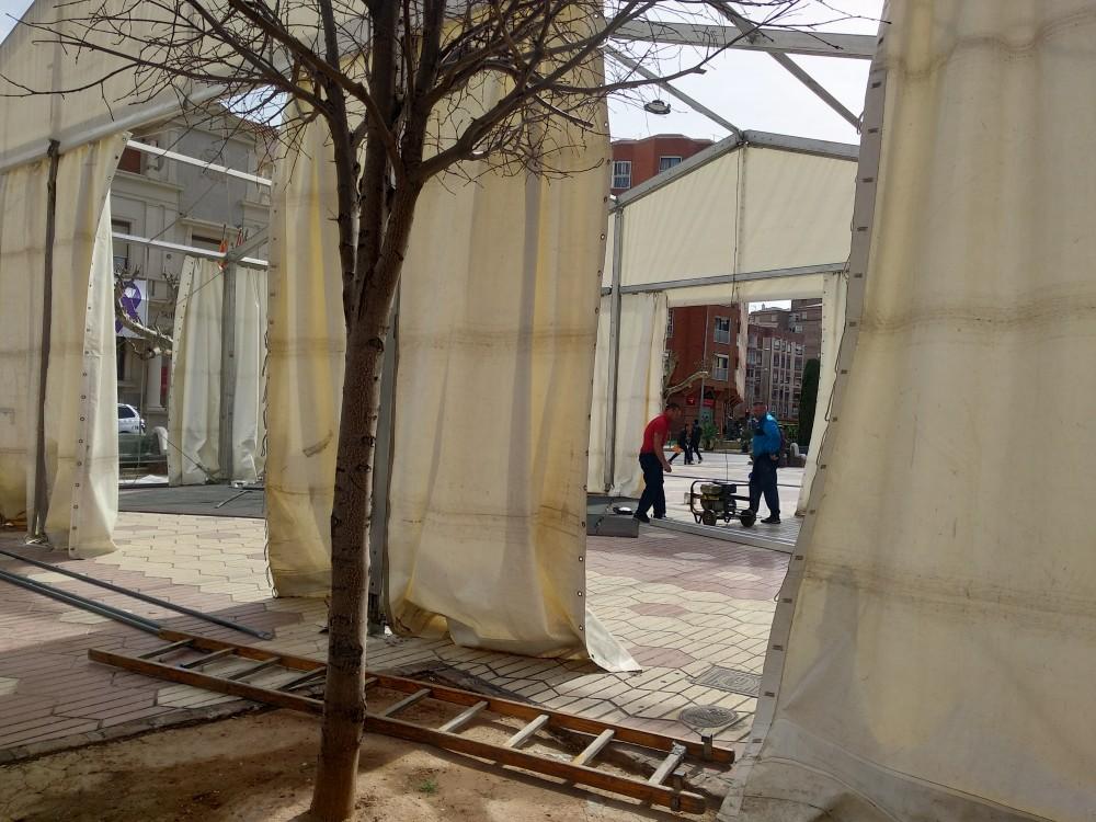 Otro de los lugares en los que se trabaja desde primera hora de esta mañana es en el Mesón de la Tapa y la Cerveza, en la plaza España. Allí varios operarios están levantando, sin descanso, toda la infraestructura de este mesón que acogerá durante la semana de fiestas a miles de personas.