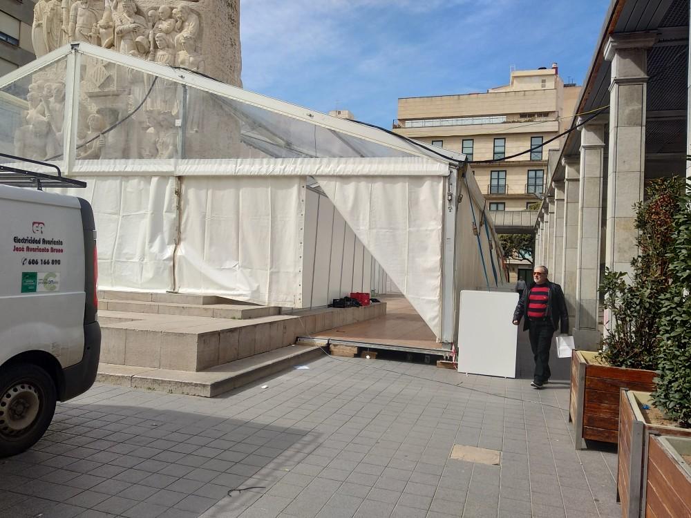 En la plaza Santa Clara también están trabajando ya en la instalación de la carpa para el Mercado Gastronómico, un lugar de reunión para todos aquellos que no quieren salir del centro de la ciudad durante las fiestas.