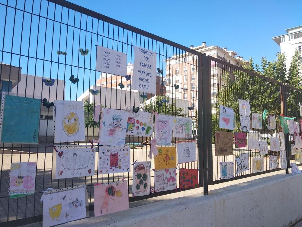 Este reto también ha contado con la participación de las docentes de infantil con un bonito mensaje para todos sus alumnos 'Gràcies per formar part del nostre camí' y mariposas alrededor (como se ve en la imagen superior de la izquierda) para que sepan que, aunque no se pueden ver presencialmente ni jugar juntos durante estos meses, volverán con más fuerza el curso que viene.