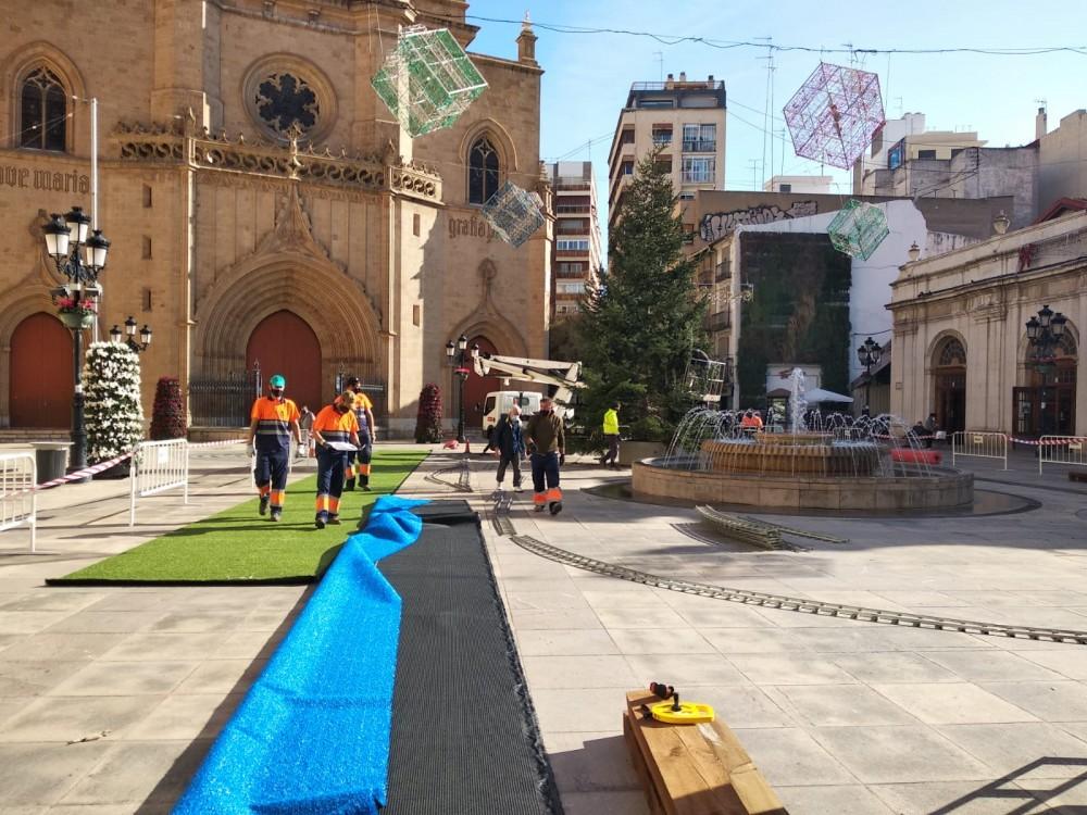 Numerosas personas, especialmente mayores, contemplaban durante la mañana los trabajos de los operarios que se afanaban en instalar el gran árbol de Navidad en el centro de la plaza, frente al consistorio castellonense, y otros que hacían lo propio con las alfombras y los utensilios que servirán para montar las distintas zonas de los jardines para que estén listas a partir del fin de semana.