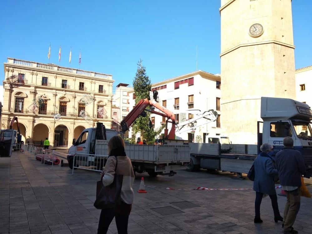 Castelló ha comenzado el montaje del árbol de Navidad en la plaza Mayor y de los jardines efímeros navideños que dará vida al centro de la ciudad para las próximas fiestas, en un año especialmente difícil por la situación de crisis sanitaria por el coronavirus.