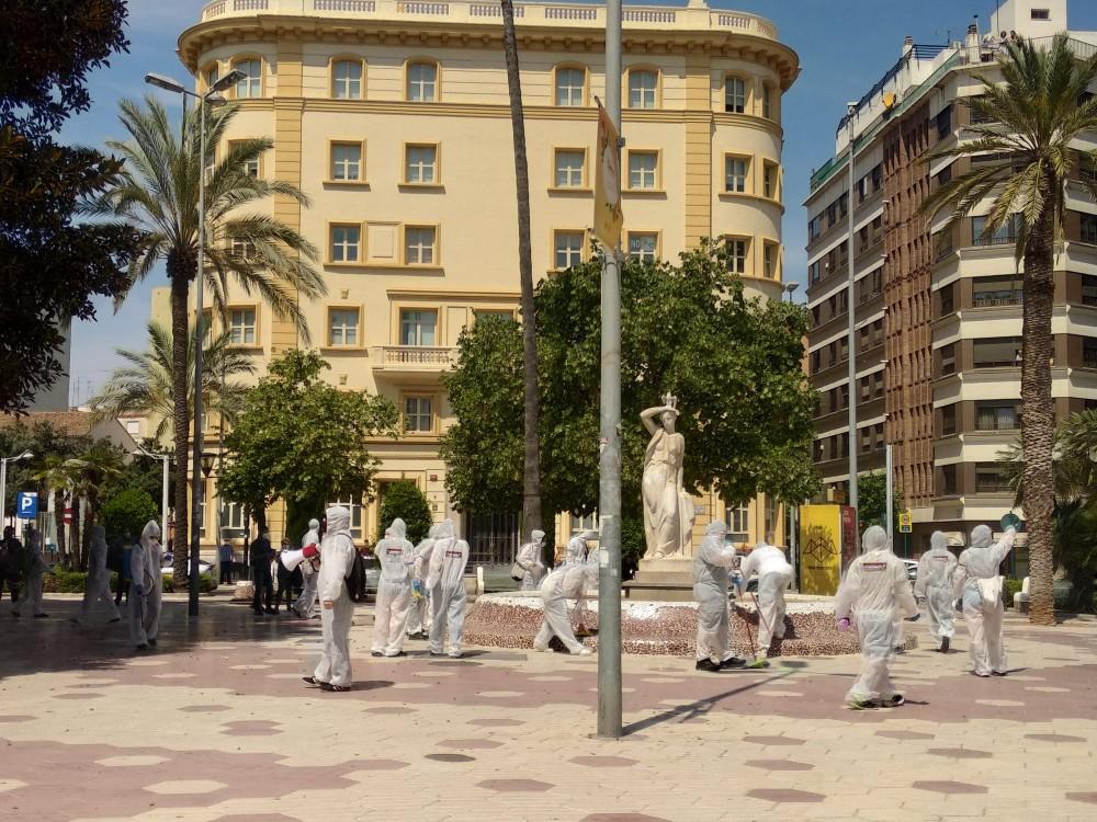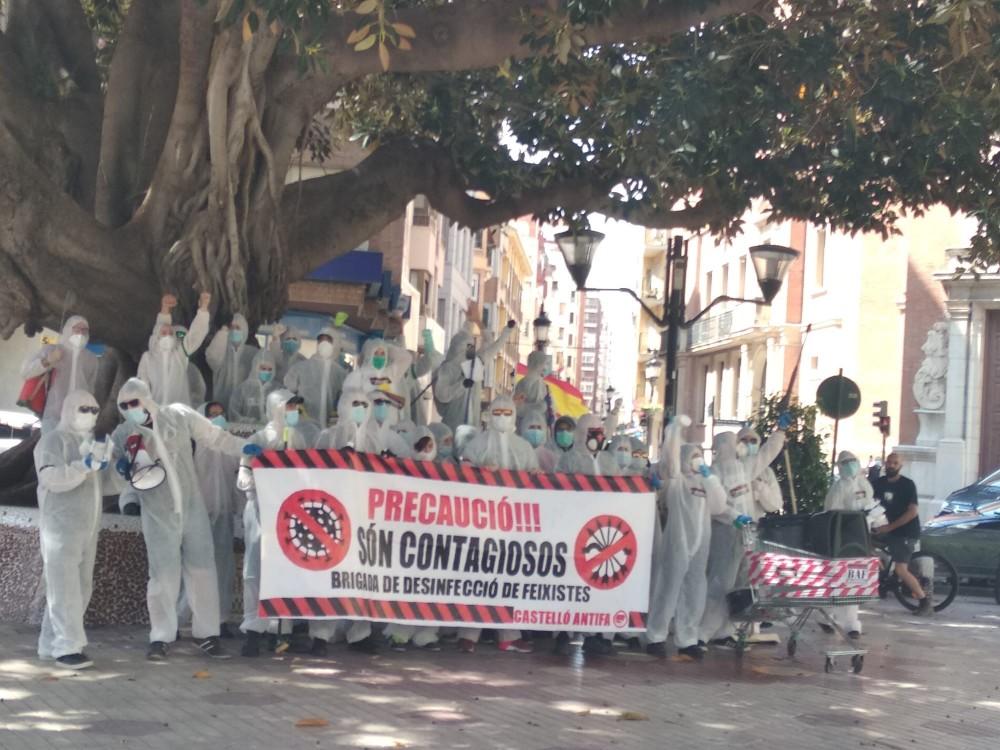 La 'Brigada de Desinfección de Fascistas', según se han presentado mediante una pancarta, coreaban gritos contra los manifestantes y posteriormente han realizado una 'performance' limpiando la plaza María Agustina con varias escobas y material de desinfección.