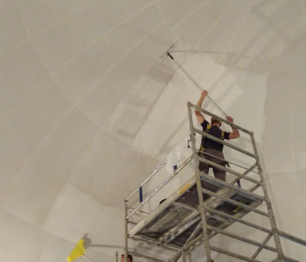 Està acometent durant aquests dies treballs de manteniment i neteja de la pantalla de la cúpula per a millorar la lluminositat de les projeccions