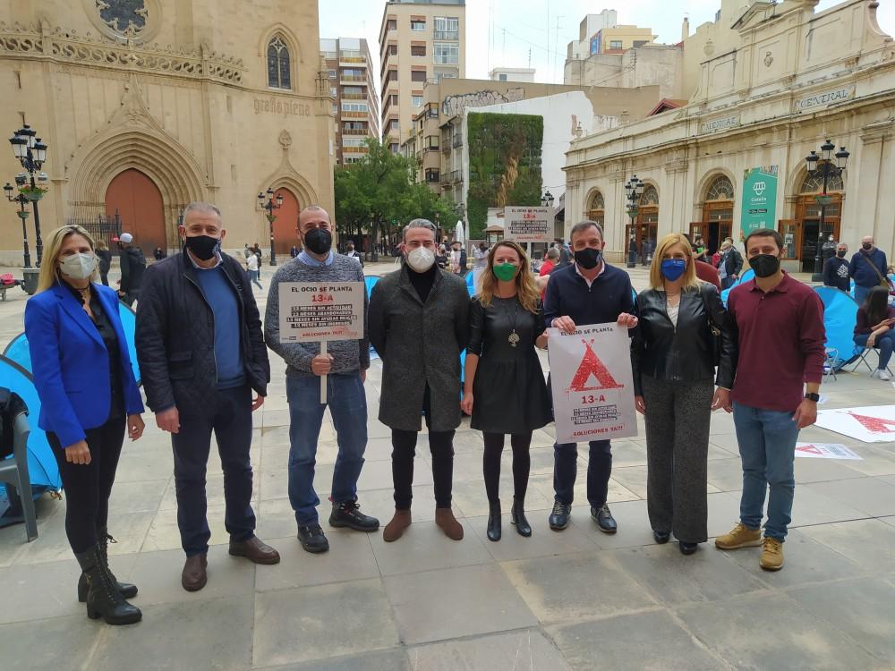 La portavoz del Grupo Municipal Popular en el Ayuntamiento de Castellón, Begoña Carrasco, junto a los concejales de PP Susana Fabregat, Sergio Toledo, Juan Carlos Redondo, Vicent Sales y la senadora por Castellón, Salomé Pradas, han trasladado su apoyo hoy al sector del ocio nocturno en la acampada-protesta que ha organizado la asociación On Castellón frente al ayuntamiento. “Apoyamos su justa reivindicación para que el equipo de gobierno de Amparo Marco dé cumplimiento al acuerdo plenario, aprobado hace seis meses, en el que el Ayuntamiento debería de haber destinado ya ayudas directas y específicas al sector del ocio nocturno por el tiempo que han estado cerrados debido a la pandemia, que ya son 13 meses”, explica Carrasco.