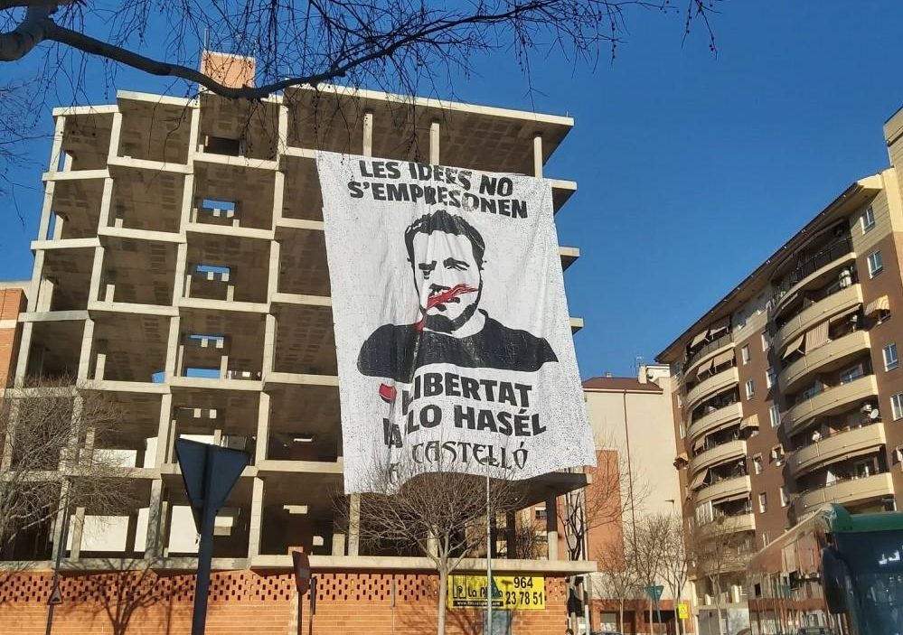 Des del més alt d'un edifici en construcció al costat de la rodona de l'avinguda Doctor Clarà amb el carrer Vila-real ha aparegut una gran pancarta amb la imatge del raper Pablo Hasél amb la boca tapada per pintura roja i el text 'Les idees no s'empresonen. Llibertat Pablo Hasél'.