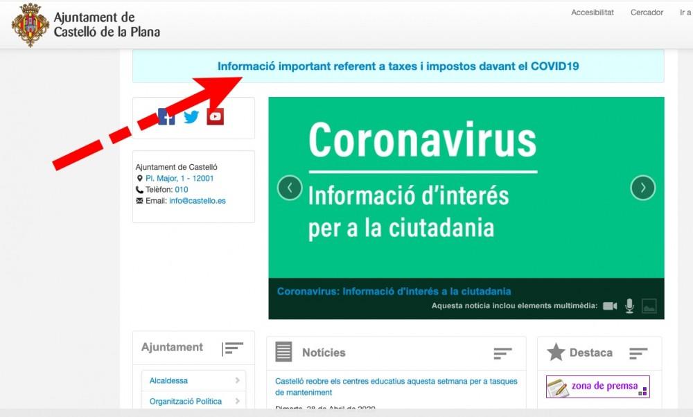 De este modo, se puede acceder mediante el enlace http://www.castello.es/web30/pages/area_web20.php?cod0=28 o entrando en http://castello.es y pulsando sobre el nuevo banner 'Información importante referente a tasas e impuestos ante la covid-19'.