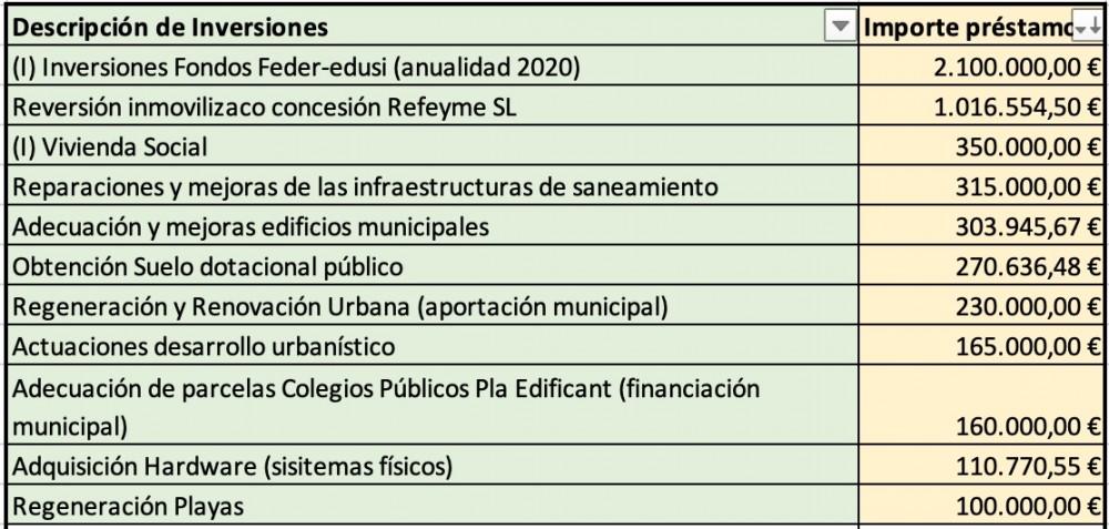 El préstamo original que figuraba en el proyecto del presupuesto contemplaba otra partida denominada: "Ilum Led Alumbrado Fondos Feder (anualidad 2020)", dotada con una cantidad de 2.726.322,66 euros, además de la partida de Fondos Feder calculada en 2.100.000 euros, que en este caso no aparece en la finalidad de inversión del préstamo.