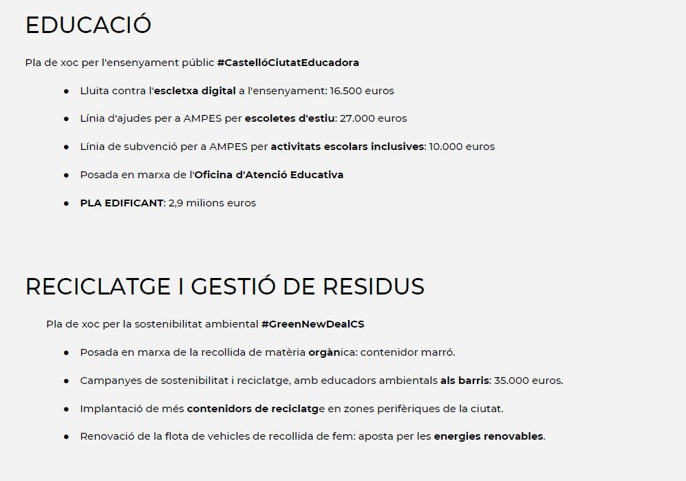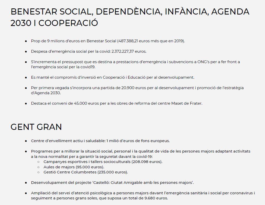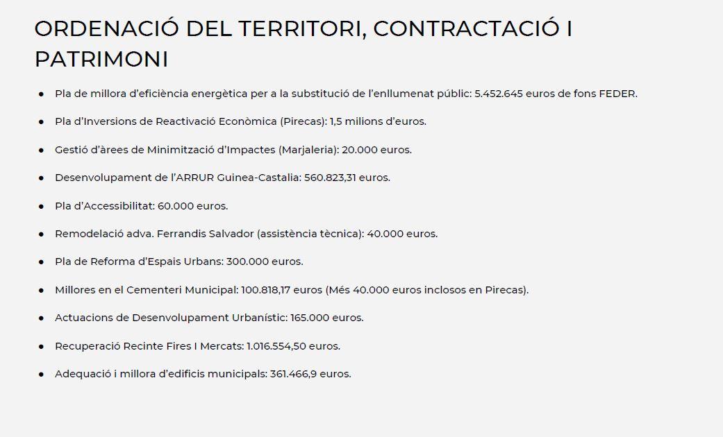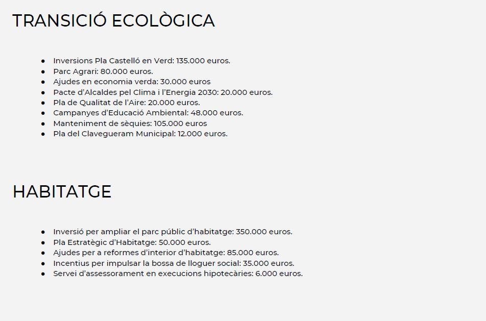 Por último han definido las cuentas presentadas como un presupuesto verde que apuesta por las políticas de sostenibilidad ambiental priorizando la transición ecológica, se invertirá en la dignificación de los centros educativos a través del plan de reforma de escuelas a través del Pla Edificant, se atenderá la emergencia habitacional con actuaciones para ampliar y mejorar el parque de vivienda social, se implica en la igualdad de oportunidades, los derechos de la mujer y los colectivos más vulnerables y reactivará la cultura, el deporte y el turismo.