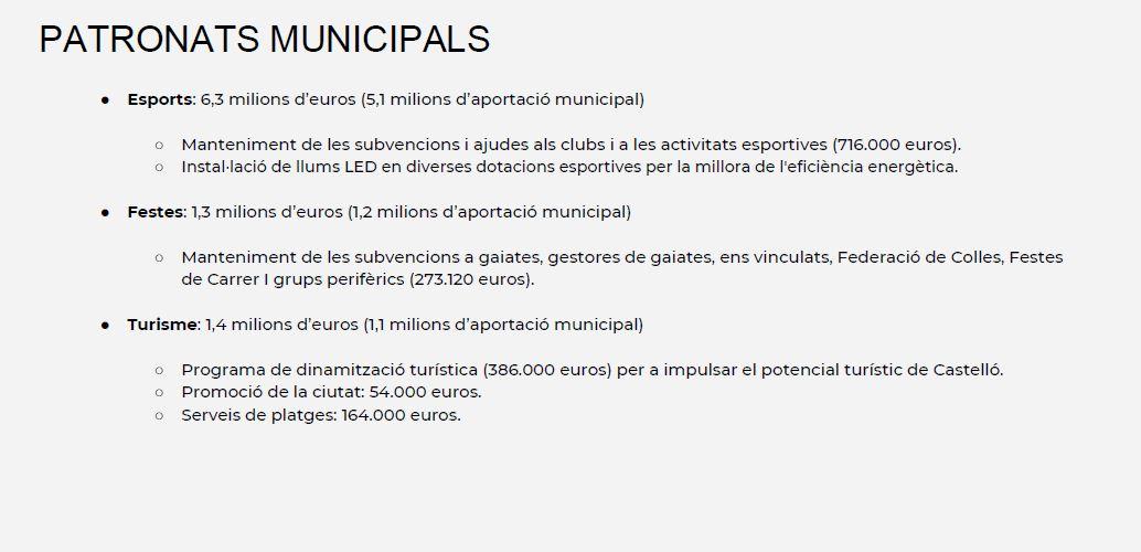 También apuesta por la ocupación a través del Plan Castelló Contrata que estará dotado con 2,3 millones de euros, el Plan Inversiones de Reactivación Económica (Pirecas) dotado con 1,5 millones de euros. En esta partida se va a crear una nueva línea de ayudas dirigidas a autónomos, microempresas y pymes y se mantendrán los ‘Jornals de Vila’ con 2 millones de euros.