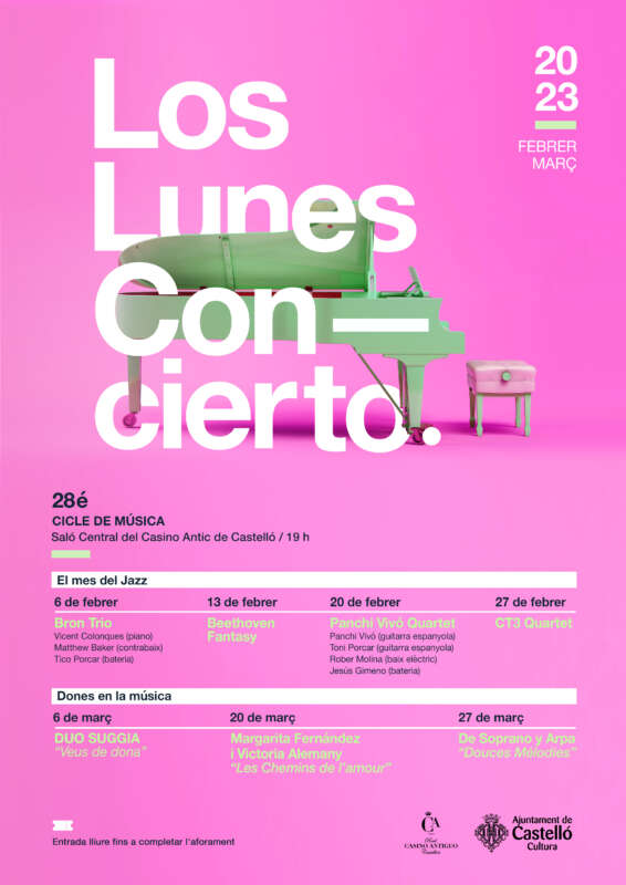 Los Lunes Concierto vuelve una temporada más a la agenda cultural de Castelló con siete conciertos dedicados al jazz durante el mes de febrero y a las mujeres en la música el mes de marzo. La Concejalía de Cultura ha programado el 28º ciclo al Real Casino Antiguo de Castelló desde este mismo lunes 6 de febrero hasta el 27 de marzo, haciendo un paréntesis para las fiestas de la Magdalena, con intérpretes muy conocidos en Castelló y la provincia, que se suman, por un lado, a la programación del Festival Jazz a Castelló, y por otra, a la programación alrededor del 8 de Marzo Día Internacional de las Mujeres.